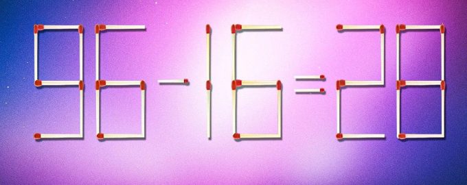 Nižšie teda uvidíte obrázok, na ktorom sú zápalky rozložené rovnosťou 96-16=28. Je však zrejmé, že z matematického hľadiska niečo nie je v poriadku.