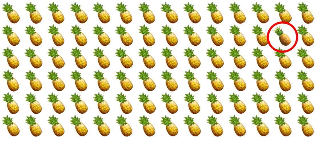 Na obrázku je veľa ananásov, sú zobrazené v niekoľkých radoch. Vašou úlohou je nájsť špeciálny ananás, ktorý sa líši od všetkých ostatných.