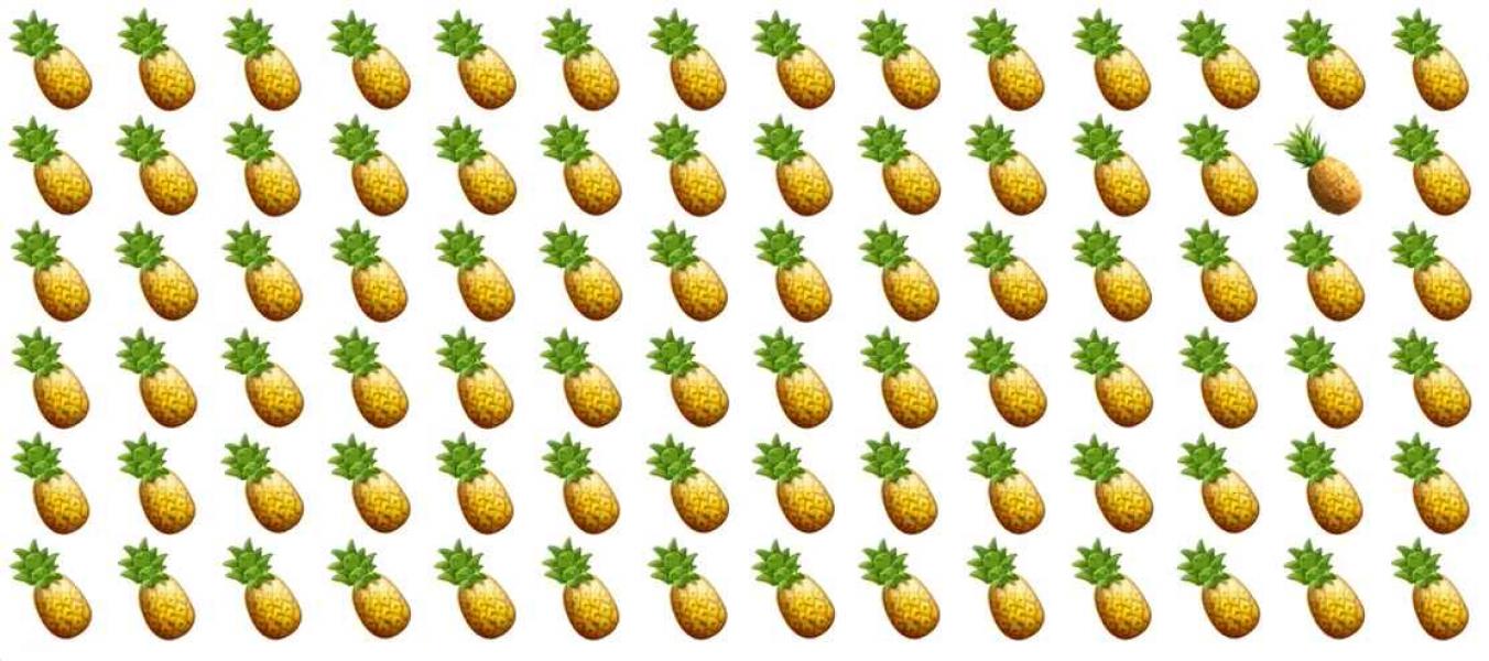 Vyriešte jednoduchú, ale veľmi zložitú hádanku – musíte nájsť špeciálny ananás, ktorý sa líši od všetkých, ktoré vidíte na obrázku.