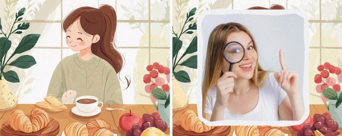 Na obrázkoch je roztomilé dievča, ktoré si vychutnáva raňajky v kuchyni. Popíja kávu (alebo čaj) s chutnými croissantmi. A ako dezert si má dať fruiti. Obrázky vyzerajú takmer identicky, sú medzi nimi štyri jemné rozdiely. Podarí sa vám ich nájsť?