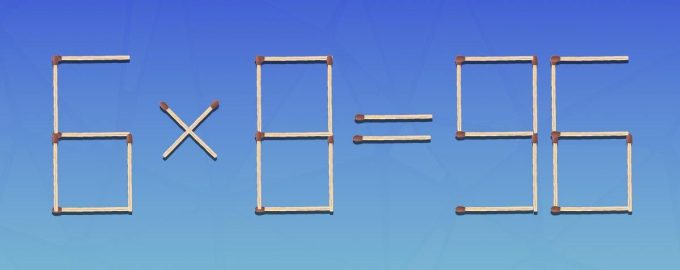 Nižšie teda uvidíte obrázok, na ktorom je rovnosť 6×8=96 zložená zo zápaliek. Na jej vytvorenie sme použili 29 zápaliek. Je zrejmé, že z matematického hľadiska táto rovnosť nie je správna.