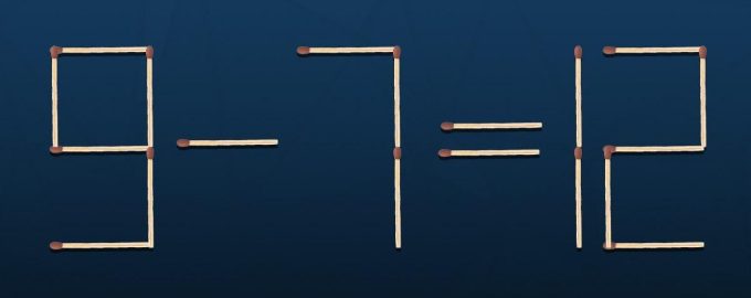 Nižšie vidíte obrázok, na ktorom boli zápalky použité na vytvorenie rovnosti 9-7=12. Celkovo bolo použitých 19 zápaliek.