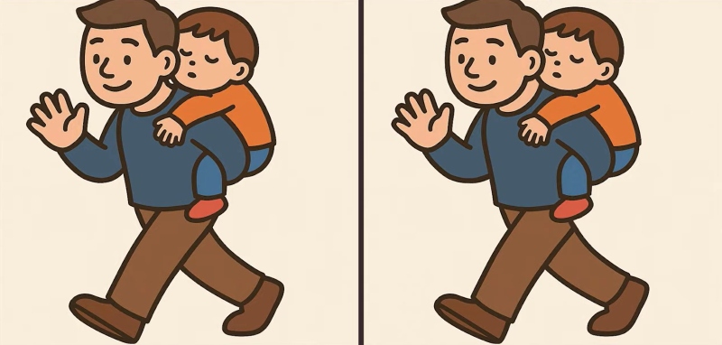 Tak čo, ste pripravení na ďalšiu výzvu? Pozorne si prezrite dva obrázky muža, ktorý nesie na chrbte dieťa. Na prvý pohľad môžu vyzerať rovnako, ale sú tu tri malé rozdiely. Myslíte si, že ich všetky nájdete za 19 sekúnd? Skúste to a otestujte svoju ostrosť videnia!