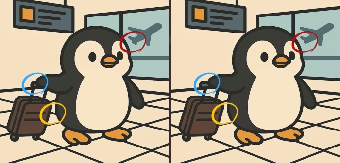 Tak čo, ste pripravení na ďalšiu výzvu? Pozrite sa pozorne na dva obrázky roztomilého tučniaka, ktorý nesie batožinu na letisku. Na prvý pohľad môžu vyzerať rovnako, ale skrývajú sa na nich tri malé rozdiely. Myslíte si, že ich všetky nájdete za 61 sekúnd? Vyskúšajte to a otestujte svoju ostrosť zraku!