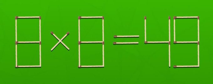 Nižšie uvidíte obrázok, na ktorom sú zápalky rozložené rovnosťou 8×8=49. Je zrejmé, že je tu chyba, pretože súčin týchto čísel by sa mal rovnať 64.