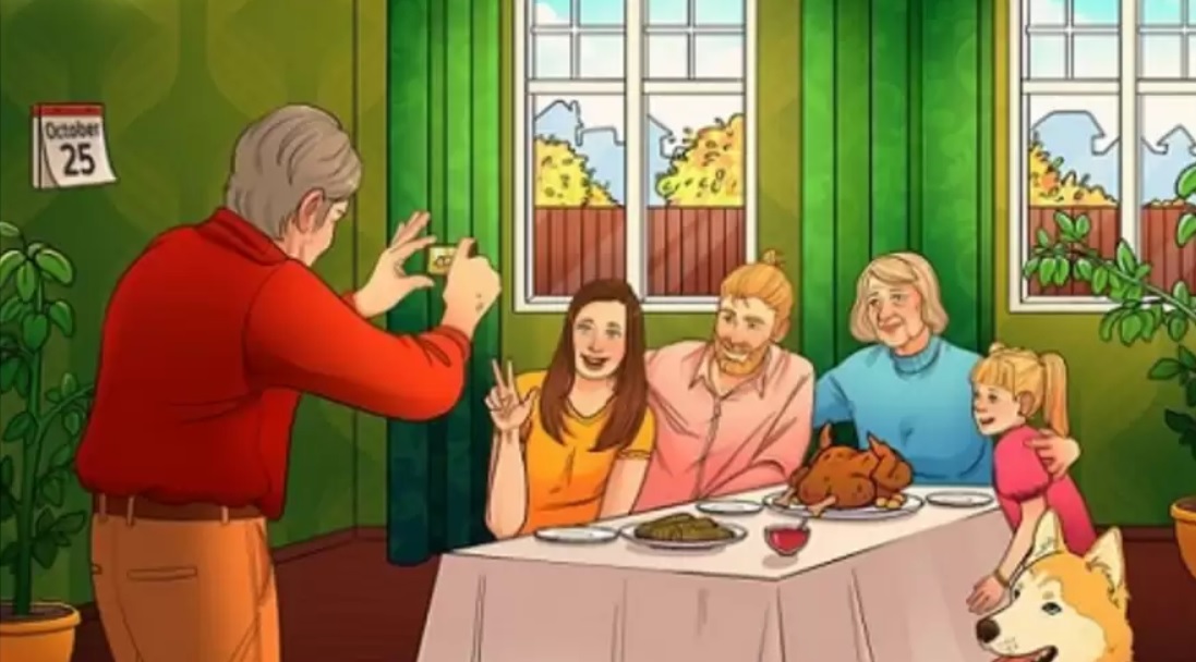Dátum v kalendári by mal byť 22. október. Na obrázku je zobrazená rodina oslavujúca Deň vďakyvzdania, čo naznačuje pečený moriak – tradičné jedlo tohto sviatku. Na Ukrajine pripadá Deň vďakyvzdania na 22. októbra.