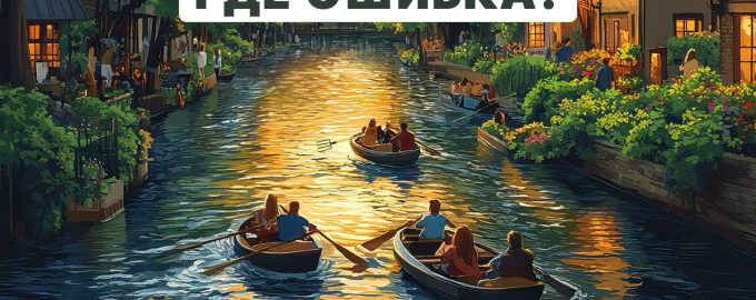Pred sebou máte obrázok, na ktorom je zobrazená krásna krajina večerného mesta. Medzi domami tečie rieka, po ktorej plávajú ľudia v člnoch. Na prvý pohľad sa obrázok zdá byť normálny, ale v skutočnosti je na ňom hrubá chyba.