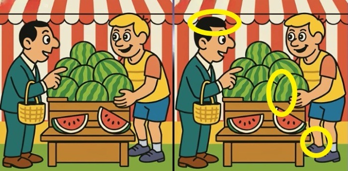 Tak čo, ste pripravení na túto výzvu? Pozrite sa pozorne na dva obrázky muža, ktorý si kupuje melón. Na prvý pohľad môžu obrázky vyzerať rovnako, ale sú tu tri malé rozdiely. Myslíte si, že ich všetky nájdete za 27 sekúnd? Vyskúšajte to a otestujte svoju ostrosť zraku!