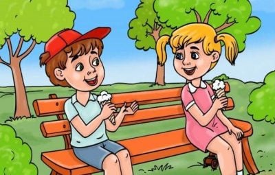 Na obrázku vidíme chlapca a dievča, ktorí sedia na lavičke v parku a jedia zmrzlinu. V pozadí vidíme stromy s veľkými zelenými korunami. Poveternostné podmienky zobrazené na obrázku naznačujú, že dej sa odohráva v lete.